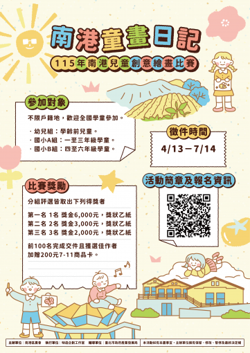 為推動兒童在地認同教育與藝術美感扎根,特辦理「南港童畫日記—115年兒童創意繪畫比賽」,鼓勵學童透過藝術創作,從日常生活、飲食文化與在地自然景觀出發,以畫筆表達對南港這片土地的觀察與情感。