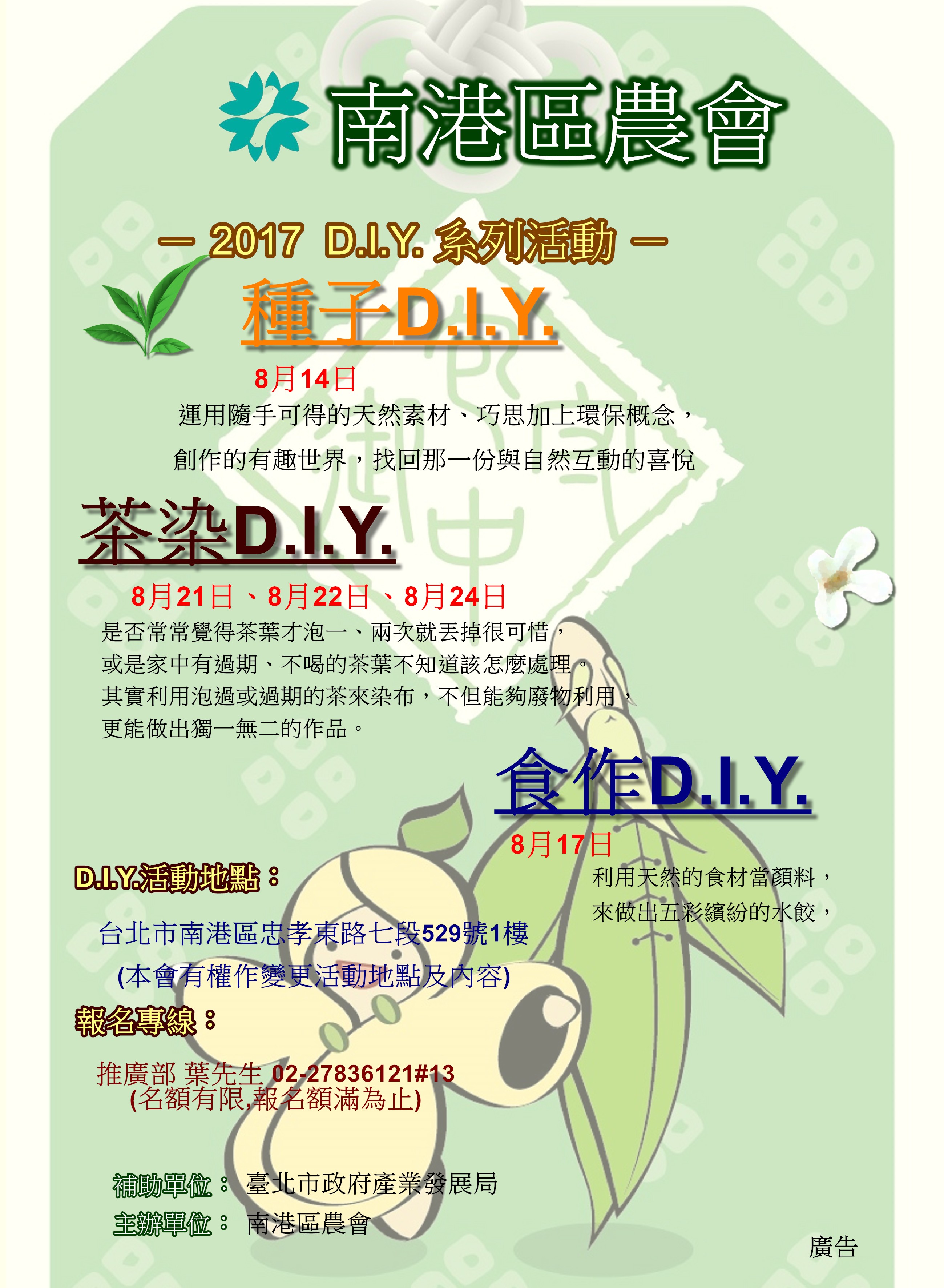 南港區農會特別為您與小孩安排了茶染DIY、種子DIY、食作DIY等活動,